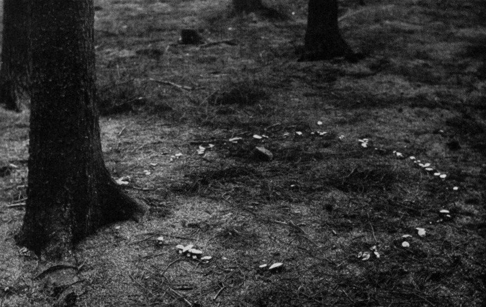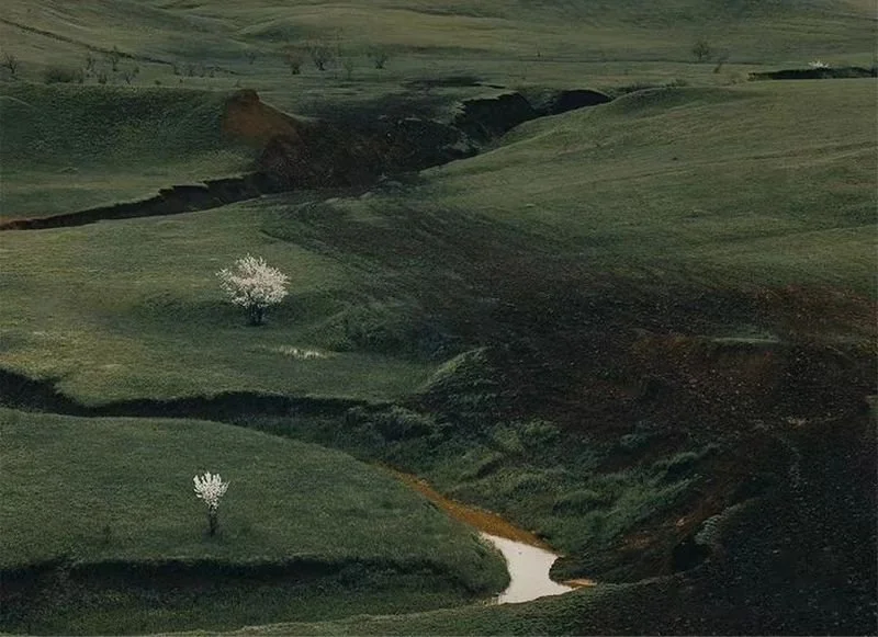 Rounded & hollow forms resembling a body of water with surrounding vegetation.