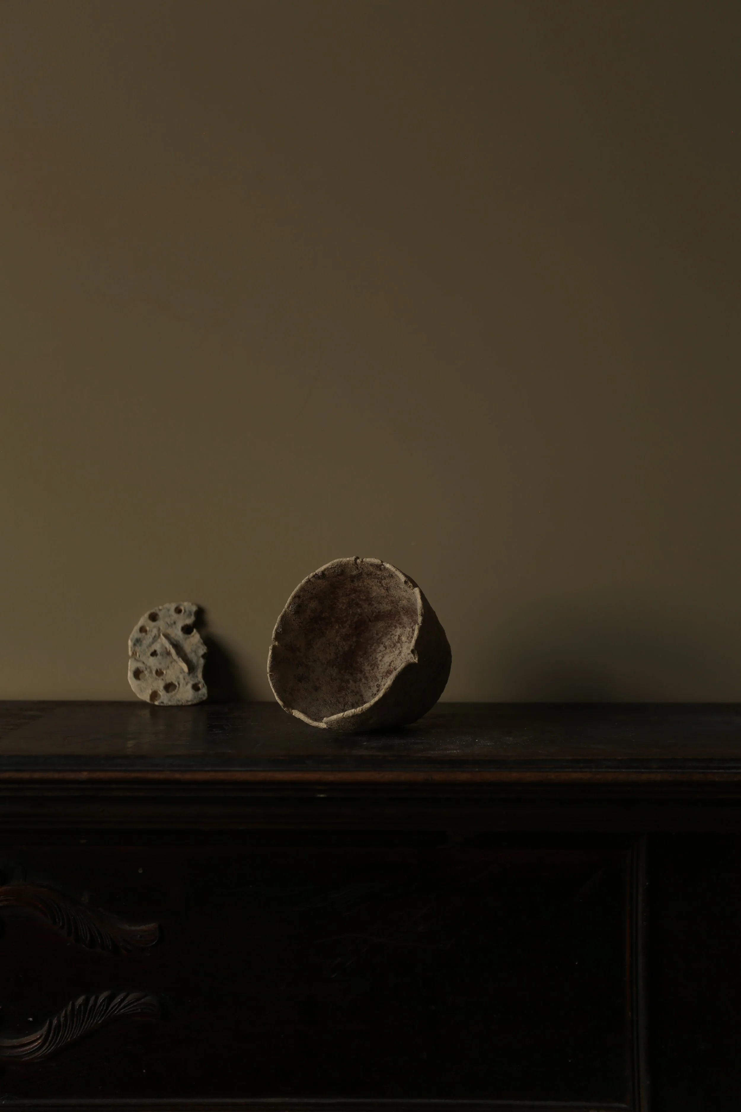 Captivated by ceramic forms providing key subject matter through imagery, the inclusion of ceramic material & soil are also used as a primary resource to stain paper & canvas - conveying a relationship between the physical artwork and the ‘state of being’ that is translated from. With the figurative composition, some works convey a closely intimate focal point where the figuration may be lost and full abstraction / linework take precedence.